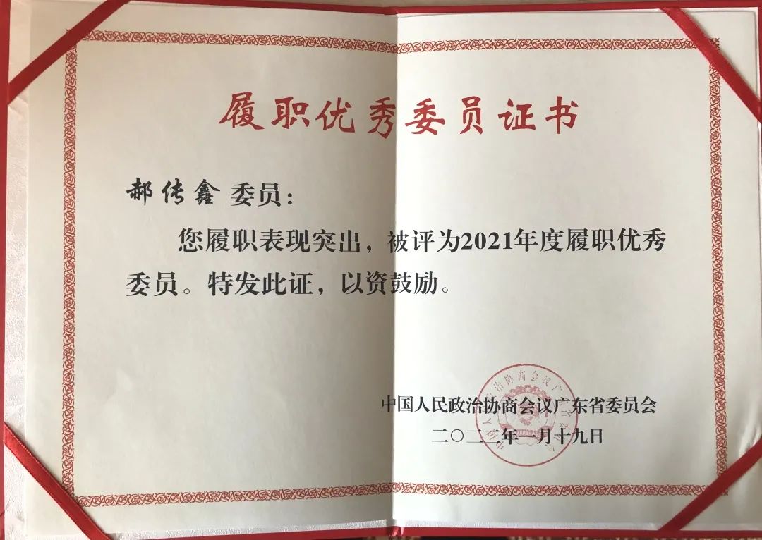 會上,廣東省政協(xié)對43件優(yōu)秀提案、21名履職表現(xiàn)突出的委員予以表彰。廣東省新的社會階層人士聯(lián)合會副會長、中華全國專利代理師協(xié)會副會長、廣東專利代理協(xié)會會長、三環(huán)總經(jīng)理郝傳鑫榮獲政協(xié)廣東省委員會“2021年度履職優(yōu)秀委員”稱號。
