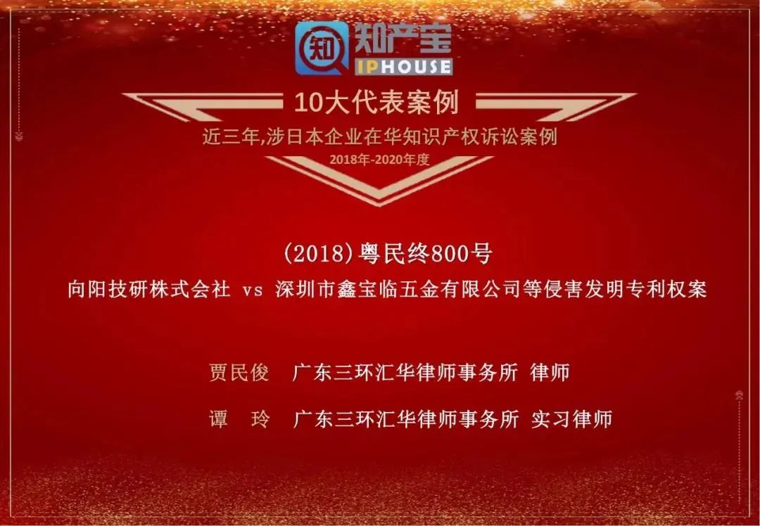 三環(huán)賈民俊律師、譚玲實習律師代理的向陽技研株式會社訴深圳市鑫寶臨五金有限公司等侵害發(fā)明專利案被評為“近三年,涉日本企業(yè)在華知識產(chǎn)權訴訟案例—10大代表案例”。
