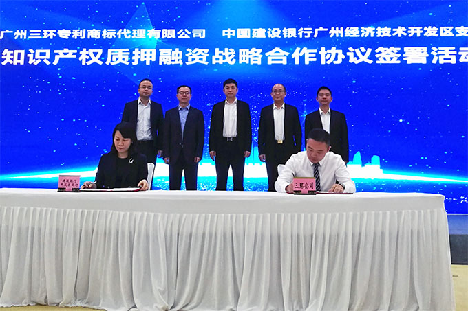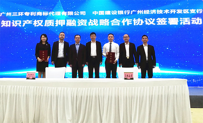 會上,在廣州市知識產(chǎn)權局協(xié)調(diào)合作處調(diào)研員柯杰兵、廣州開發(fā)區(qū)知識產(chǎn)權局局長劉石、三環(huán)總經(jīng)理郝傳鑫等相關嘉賓的見證下,三環(huán)副總經(jīng)理申屠嘉毅、中國建設銀行廣州經(jīng)濟技術開發(fā)區(qū)支行副行長周穎梅分別代表雙方簽訂了知識產(chǎn)權質(zhì)押融資戰(zhàn)略合作協(xié)議。
