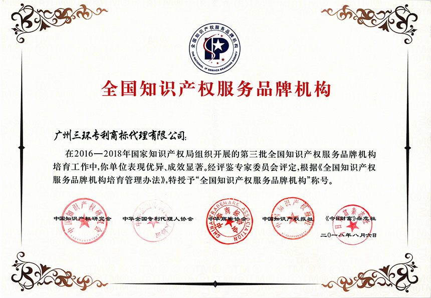 為樹立標桿典型、發(fā)揮示范作用,國家知識產(chǎn)權局于2016年至2018年組織開展了第三批全國知識產(chǎn)權服務品牌機構培育工作。在評鑒過程中,由政府部門、行業(yè)協(xié)會、媒體等各界人士組成專家委員會,從加強服務能力、創(chuàng)新服務模式、提升服務效益和打造服務品牌等方面,綜合考察培育機構工作成效,并確定出“全國知識產(chǎn)權服務品牌機構”的最終名單。三環(huán)不僅憑借強勁的實力入選培育名單,且在培育期間表現(xiàn)優(yōu)異,綜合實力顯著提升,順利通過重重考驗,榮獲了“全國知識產(chǎn)權服務品牌機構”稱號。