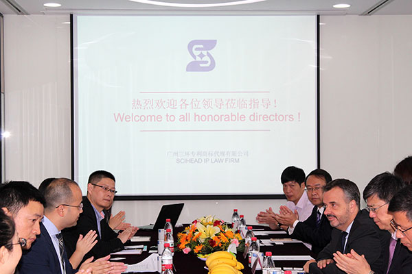 2017年6月14日上午,由中國國家知識產(chǎn)權(quán)局國際合作司吳凱司長帶隊(duì),世界知識產(chǎn)權(quán)組織(WIPO)PCT法律司副司長Matthias Reischle-Park先生、PCT法律司高級法律官員俞志龍、國家知識產(chǎn)權(quán)局國際合作司二處董剛副處長、國際合作司二處項(xiàng)目官員陳文軍先生,在廣東省知識產(chǎn)權(quán)局協(xié)調(diào)與合作處調(diào)研員王開智和廣東省專利代理協(xié)會秘書長陳一忠的陪同下,一行7人赴我公司調(diào)研,我公司郝傳鑫總經(jīng)理及PCT申請相關(guān)人員就PCT專利申請業(yè)務(wù)、系統(tǒng)的相關(guān)管理及改進(jìn)等問題進(jìn)行了將近兩小時(shí)的會議交流。會上俞志龍先生介紹了WIPO發(fā)布關(guān)于PCT申請的最新動態(tài),之后我公司與會人員向各位領(lǐng)導(dǎo)匯報(bào)了我公司近年來PCT的申請情況及申請過程中遇到的問題并提出相關(guān)建議,各位領(lǐng)導(dǎo)就這些問題和建議給予了意見。