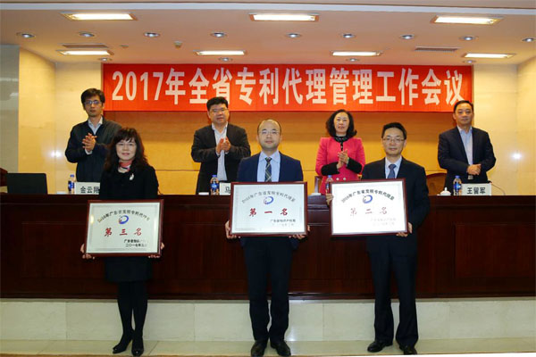 會(huì)議現(xiàn)場(chǎng)對(duì)2016年廣東省發(fā)明專利代理量、PCT國(guó)際專利申請(qǐng)代理量前三名的代理機(jī)構(gòu)進(jìn)行了表彰,并頒發(fā)了銘牌。三環(huán)包攬了上述兩個(gè)獎(jiǎng)項(xiàng)的第一名。